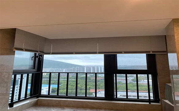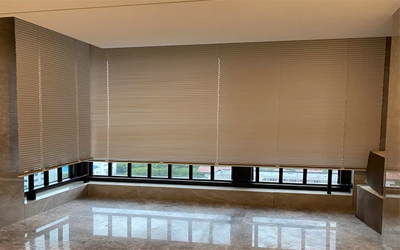 室内电动铝百叶使用铝合金帘片,通过卷绳系统带动帘体的上下运行及帘片翻转,起到光线调节与导引,遮阳隔热及装饰美化的作用。室内百叶帘安装于室内或双层玻璃间,使用寿命长,易于清洁与维护(无风力影响),易于安装,造价较低(相对于室外百叶),同时对建筑结构没有影响;配合高反射玻璃或双层呼吸式幕墙玻璃的优化组合的动态使用。